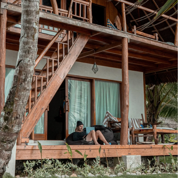 The resort includes four bedrooms and one family villa, with a maximum capacity of 12 guests. Both private and shared rooms are available. We never host more than two guests per room to ensure a high standard of comfort. You’ll fall asleep and wake up to the sound of the ocean.